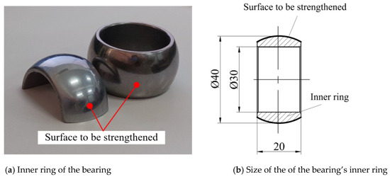 The inner ring of the knuckle bearing used in this study (which is manufactured by Fujian Longxi Bearing (Group) Co., Ltd., Zhangzhou, China) is shown in Figure 1a, and its dimensions are detailed in Figure 1b. This inner ring is composed of GCr15 steel, and the primary chemical composition of this material is outlined in Table 1. Prior to undergoing laser quenching treatment, the inner ring has already been subjected to quenching and finishing processes by the manufacturer. The outer surface of the inner ring is the area to be strengthened in this paper. Notably, the surface hardness of this region is marginally lower than that of the matrix material, measuring 56 ± 0.5 HRC, with a depth of approximately 0.05 mm. In contrast, the hardness of the matrix material beneath the surface is about 59 ± 1 HRC. Additionally, the surface roughness of the material ranges from 0.48 to 0.72 μm. The outer surface of the bearing inner ring is spherical.