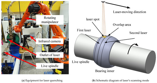 Laser quenching technology is a hot spot technology that utilizes a laser to enhance the surface properties of materials. This approach leverages the benefits of high energy density and localized modification of laser beams to attain superior quenching effects on metals, consequently enhancing the hardness, wear resistance, and corrosion resistance of the material [3,4]. It has attracted widespread attention in the field of bearing strengthening.
