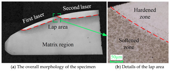 Figure 3a illustrates the overall morphology of the enhanced sample section as observed under an optical microscope, utilizing a power setting of 800 W and a laser irradiation angle of 0°. In contrast, Figure 3b presents a magnified view of the lap area captured using a 50× light lens.