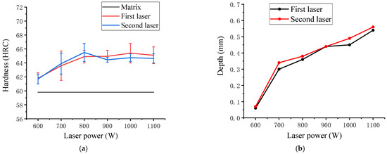 Variation of sample hardness with laser power. (a) Relationship between hardness and laser power. (b) Relationship between hardening layer’s depth and laser power.