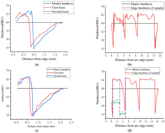 Figure 6b and Figure 7a are the hardness test results along the depth direction and the edge direction when the laser power is 900 W and the laser irradiation angle is 0°, respectively; Figure 6d and Figure 7c are the hardness test results along the depth direction and the edge direction when the laser power is 900 W and the laser irradiation angle is 10°, respectively.