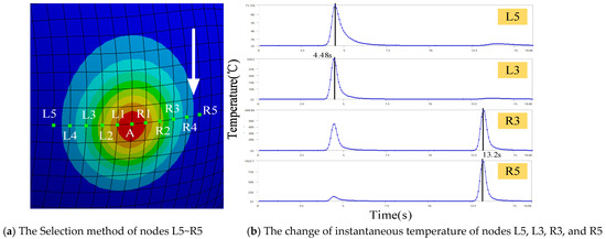 According to the simulation results, all nodes in Figure 8a have relatively drastic temperature fluctuations near 4.48 s and 13.2 s, in which the peak temperature of nodes L5~R2 is near 4.48 s, and that of nodes R3~R5 is near 13.2 s, and the temperature of these nodes is basically stable below 40 °C in the rest time. The second peak temperature fluctuation of node A at 12.9~13.8 s is 127 °C, which is the temperature increase caused by the second laser scan to the similar position of the model surface, but this temperature is no longer enough to affect the material’s properties. Other nodes also have similar situations, but the temperature fluctuation is smaller. The temperature change trend at node R5 shows a peak temperature fluctuation of 141 °C around 4.48 s, which is the heat generated when the laser spot moves to the vicinity of node A. In the vicinity of 13.2 s, it produced a second temperature fluctuation, and the peak temperature reached 1010.5 °C. The above phenomenon shows that in the laser quenching process using the overlap process, the hot zone generated by different passes of the laser will have a certain mutual influence.