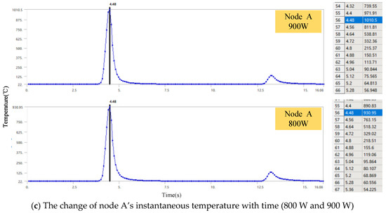 Figure 12a shows the temperature changes at node A from 3.92 to 5.6 s under 800 W and 900 W conditions; Figure 12b shows the cooling speed changes during this period, which is obtained from Equation (3). In Figure 12b, a positive cooling speed indicates that the material is in a heating process, while a negative cooling speed indicates that the material is in a cooling process.