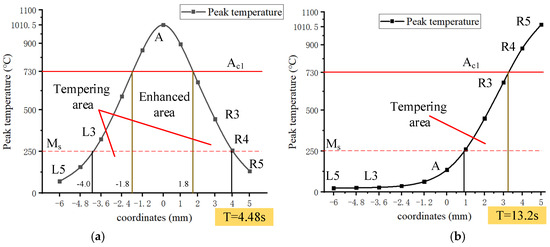 The Ms (Martensite Start temperature) of GCr15 material is generally between 200 and 300 °C, with 250 °C specified in this paper. The Ac1 temperature in this paper is 730 °C, so it can be considered that the bearing inner ring used in this paper will experience varying degrees of tempering within the range of 250 to 730 °C. Combined with these characteristic temperatures and node temperature data in Figure 8, the temperature distribution curves of the sample’s surface at 4.48 s and 13.2 s under 900 W power are shown in Figure 8b and Figure 9a. The horizontal coordinate in Figure 9 is the position of nodes L5~R5 in Figure 8a, node A is the coordinate point 0, and the node of L5 to R1 is negative. The nodes of R1 to R5 are positive.