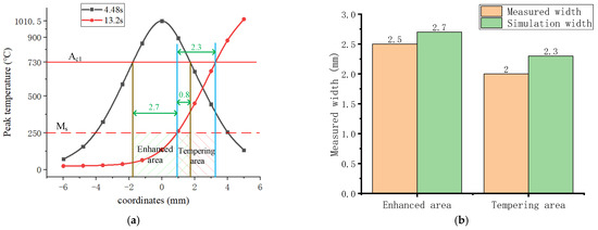 As can be seen from Figure 9a, when the laser spot is scanned to node A, the temperature decreases on both sides of it, and the temperature reaches Ac1 at a distance of 1.8 mm from the center of the heat source under the power of 900 W. The hot zone generated by the laser spot is approximately symmetrically distributed; therefore, the width of the strengthened zone generated on the material surface is about 3.6 mm. In Figure 9a, the peak temperature of the material in the region of about 1.8~4 mm from the center of the laser spot is 250~730 °C, which is in the high-temperature tempering and medium-temperature tempering interval of the GCr15 material, and the material would undergo a certain degree of tempering phenomenon leading to a decrease in hardness and strength. As can be seen from Figure 9b, at the moment of 13.2 s, the width of the intensified zone produced by the laser spot on the left side of node R5 is about 1.8 mm, so the width of the intensified zone on both sides of the node should be about 3.6 mm. The tempering zone on the left side of node R5 is at a distance of about 1–3.2 mm from node A, which suggests that the second laser will cause the intensified zone created by the first laser to undergo tempering, and the width of the intensified zone produced by the first laser will be narrower than the 3.6 mm shown in Figure 9a. In order to verify this inference, the material’s surface temperature distribution curves at 4.48 s and 13.2 s were superimposed, and the actual distribution of the tempering zone and strengthening zone near the first laser under 900 W power was finally obtained, as shown in Figure 10a. Figure 10b shows the comparison between the actual and predicted results of the width of the strengthening zone and tempering zone generated by the first laser at 900 W, where the actual width is based on the hardness change. As shown in Figure 7d, the stable hardness enhancement area produced by the first laser at 900 W is the hardened zone, with a width of 2.4 mm; the interval where the hardness starts to decrease until the beginning of the next hardness peak is the tempered zone, with a width of 2 mm.