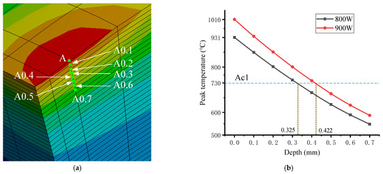 Figure 11a shows the model cross section when the laser spot is located at node A in Figure 8 and selects nodes from node A into the material and extracts the temperature at each node, with each node spaced 0.1 mm apart. The obtained node temperature profile trends are all consistent with that of node A in Figure 8c. The peak temperature distribution curve in the material’s strengthening zone along the depth direction, based on the peak temperature of nodes from nodes A~A0.7 (which appeared at 4.48 s), is shown in Figure 11b. In Figure 11b, the horizontal axis represents the depth with node A as the reference point (0 position) and extends towards node A0.7.
