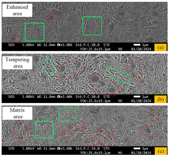 Microstructure of each region of the sample. (a) The SEM scanning images of the hardened zone. (b) The SEM scanning images of the tempering zone. (c) The SEM scanning images of the matrix zone. (The areas marked with green frames indicate martensite, while those marked with red frames indicate carbides).