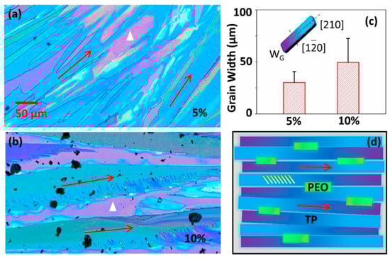 Polarized optical images showing the effect of the PEO polymer additive on modulating the grain boundary of TIPS pentacene organic crystals, including different weight ratios of (a) 5% and (b) 10%. The triangle in (a,b) marks the uncovered substrate. (c) A plot showing the change in TIPS pentacene crystal grain boundary with different loading ratios of PEO, based on six measurements. The red arrows in (a,b) represent the long axis [210] of TIPS pentacene crystals, which is also shown in (c). Crystal width, or , is measured as the width along the short axis of [10]. (d) A cartoon showing the improvement of TIPS pentacene (TP) morphology and highlighting the improved crystal alignment and grain boundary enlargement as a result of PEO polymer addition. Reproduced from reference [200], with permission from Springer.