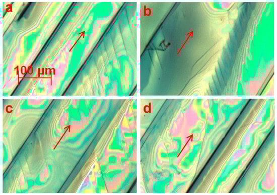 Polarized optical images in subfigures (a–d) showing the enlarged grain width of TIPS pentacene crystals with the blending of poly(butyl acrylate) as a polymer additive. All images have the same scale bar as in (a). The crystal long axis [210] is marked with arrows. Reproduced from reference [201], with permission from Springer.
