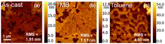 AFM height images of (a) as-cast TIPS pentacene film, (b) TIPS pentacene film with TMB solvent vapor annealing, and (c) TIPS pentacene film with toluene solvent vapor annealing. Reproduced from reference [187], with permission from MDPI.