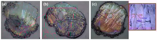 Park et al. reported the tuning of crystal alignment and grain boundaries by applying an Ar gas injection method and studied the correlation between grain boundaries and charge transport [158]. The TIPS pentacene solution was deposited onto a polyvinylphenol substrate and was applied with the Ar gas flow to promote crystallization. Figure 5 shows the different Ar gas flow rates, including (a) at 300 sccm, (b) at 500 sccm, and (c) at 1000 sccm, which resulted in TIPS pentacene thin-film morphology with different crystal alignment and grain boundaries. The thin-film morphology of TIPS pentacene was shown to depend significantly on the Ar gas flow rate during deposition. At a lower flow rate of 300 sccm, there was no clear correlation between crystal alignment and the flow direction. When the flow rate increased to 500 sccm, partial alignment of the crystals along the flow direction was observed. At the highest flow rate of 1000 sccm, the elongated crystal grains became fully aligned with the direction of the Ar gas flow. This demonstrates the effectiveness of controlled gas flow in modulating crystal alignment and improving the uniformity of thin-film morphology. When the Ar gas flow was in parallel with the direction from source to drain contact electrode, the resultant grain boundaries were also parallel with the current direction, yielding a high mobility of 0.53 ± 0.02 cm2/Vs. In contrast, when the grain boundaries were perpendicular to the flow direction, a much lower mobility of 0.06 ± 0.02 cm2/Vs was obtained because the grain boundaries blocked the current flow.