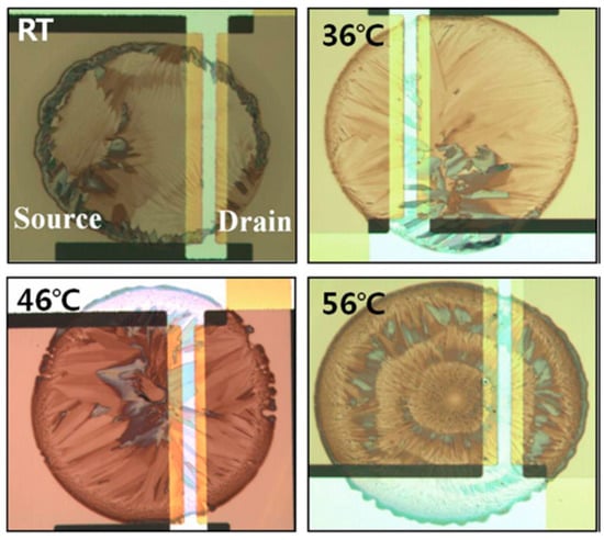 Lee et al. reported the effect of grain boundaries on charge transport in inkjet-printed TIPS pentacene [205]. In this work, polyvinylphenol polymer was first spin coated as the gate dielectric layer, followed by the deposition of gold as the source and drain contact electrodes. Then, TIPS pentacene solution was deposited onto the patterned contact electrodes via inkjet printing, while the substrate was maintained at different temperatures, including room temperature, 36 °C, 46 °C, and 56 °C. The resultant thin-film morphology of the inkjet-printed TIPS pentacene film is shown in Figure 6. Growth at room temperature results in crystal accumulation at the droplet contact line, due to the coffee ring effect. When the substrate was applied with heating, the faster evaporation of the solvent promoted crystal growth from the droplet edge towards the center, giving rise to more uniform morphology and crystal alignment. However, when the temperature further rose up to 56 °C, smaller crystals with higher grain densities were formed as a result of excessively fast solvent evaporation. Average hole mobilities of 0.09 ± 0.04 cm2/Vs, 0.21 ± 0.05 cm2/Vs, and 0.07 ± 0.03 cm2/Vs were obtained from the inkjet-printed TIPS pentacene thin-film transistor based on the temperatures of 36 °C, 46 °C, and 56 °C, respectively. The mobility at 46 °C further increased to 0.44 ± 0.09 cm2/Vs based on multi-drop TIPS pentacene devices, which incorporate grain boundaries in the same direction to minimize the impact from mobility trapping sites.