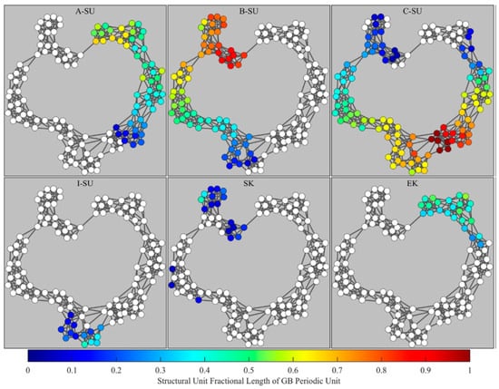 Visualization of the [100] symmetric tilt grain boundaries based on SPRING. The colored nodes represent the grain boundaries dependent on the structural unit content in the grain boundaries, as indicated in the color scale. White nodes indicate an absence of structural unit in the grain boundary. Reproduced from reference [230], with permission from Elsevier.