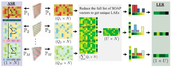 Illustration of the construction process for the ASR and LER. ASR: after forming a SOAP matrix, an averaged SOAP vector is produced based on the sum of Q columns in the matrix, which represents all grain boundaries. LER: the grouped SOAP vectors are reduced to unique vectors (a set of U) represented by unique LAE based on the SOAP similarity metric. A histogram was generated based on each grain boundary that counts the number of unique vector examples existing in the grain boundary. The LER matrix is a collection of histograms showing LEA unique for the M grain boundaries in the M × U collection. Reproduced from reference [227], with permission from Springer Nature.