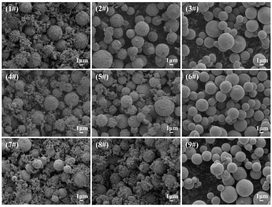 Figure 1 presents SEM images of the silver-coated copper powder prepared using the respective complexing and reducing agents listed in Table 2. As observed in Figure 1, samples 1#, 4#, and 7# contain a large amount of free silver, while the free silver content in samples 2#, 5#, and 8# is significantly lower. In contrast, samples 3#, 6#, and 9# show almost no free silver. A common feature of the three sets of samples is that the complexing agent is the same, while the reducing agent varies. This suggests that the complexing agent plays a more significant role in controlling the formation of free silver during the chemical plating process than the reducing agent.