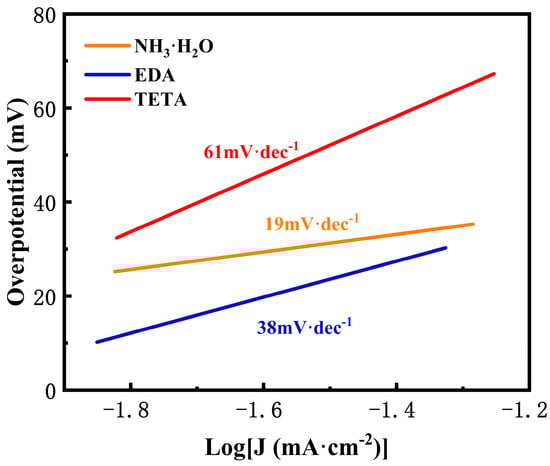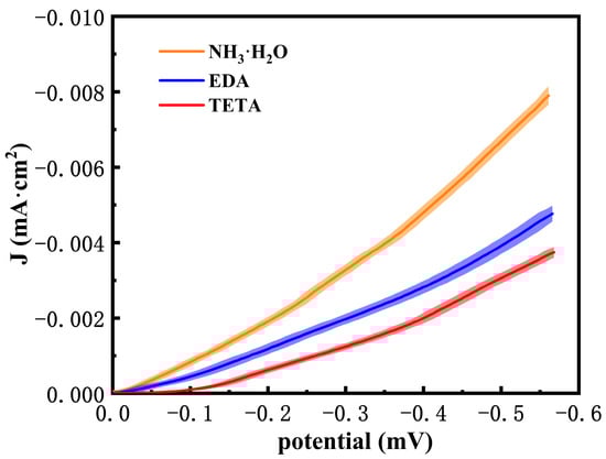 In the silver complex solution, the stability of different silver complex ions can be characterized by cathode polarization. Figure 2 shows cathode polarization curves of the working electrode in the silver complex solution with ammonia (NH3·H2O), ethylenediamine (EDA), and triethylenetetramine (TETA) as complexing agents. As shown in the figure, in the initial potential range (0~−0.0625 V), the current density is low, and the silver complex ions are not deposited at the cathode. As the electrode potential becomes negative (−0.0625~−0.25 V), the current density begins to rise. Once the electrode potential drops below −0.25 V, the polarization curves start to show differences. Among them, the slope of the polarization curve of the silver complex solution with triethylenetetramine (TETA) as the complexing agent is the smallest, the current density rises the slowest, and the cathode polarization of the silver complex solution is the most extensive, indicating that the silver complex formed by triethylenetetramine (TETA) and silver ions is most stable.