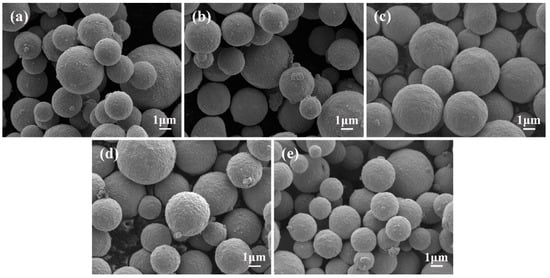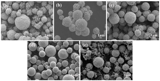 SEM images of silver-coated copper powders prepared with different PVP concentrations: (a) 0 g/L, (b) 0.5 g/L, (c) 1.0 g/L, (d) 1.5 g/L, and (e) 2.0 g/L.