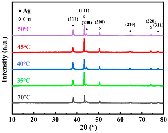 Figure 5 presents the XRD patterns of silver-coated copper powders prepared. The characteristic peaks of metallic silver (Ag) appear at 2θ = 38.2°, 44.2°, 64.6°, and 77.4°, corresponding to the (111), (200), (220), and (311) crystal planes, respectively. The characteristic peaks of metallic copper (Cu) are observed at 2θ = 43.3°, 50.5°, and 74.1°, corresponding to the (111), (200), and (220) crystal planes, respectively. The results indicated that the prepared powder was composed solely of silver and copper, without any detectable impurities.