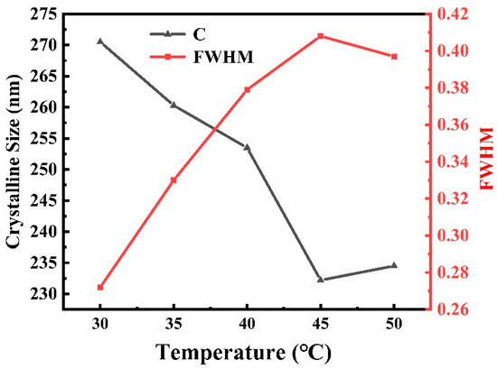 Figure 6 presents the relationship between temperature, the half-peak width of silver, and the crystal size. Full width at half maximum (FWHM) refers to a measure of the width of the diffraction peak in the X-ray diffraction (XRD) spectrum. It represents the half-height width of the diffraction peak, that is, the width of the peak when the intensity of the diffraction peak reaches half of the maximum value. The size of the half-width can reflect information such as the size and crystallinity of the grains in the sample. There is a certain inverse relationship between the half-width and the grain size [26]. According to the Scherrer equation, the grain size is calculated by the half-width of the diffraction peak. The formula for Scherrer’s law is as follows: