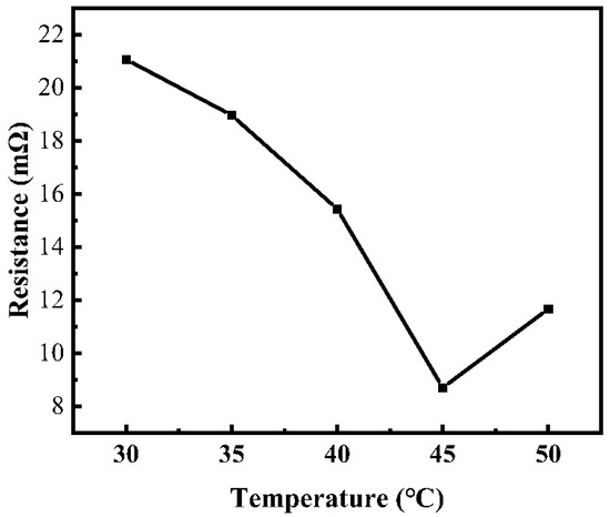 Figure 7 shows the sheet resistance curves of silver-coated copper powder prepared at different temperatures. Silver and copper have different crystal structures and conductive properties. Ideally, silver should be evenly coated on the surface of copper particles, but too much free silver may cause the silver layer to become uneven or even have areas where the silver layer is weak. In these areas, the copper surface may be exposed, and although the conductivity of copper is high, it is much lower than that of silver. Therefore, the conductivity of silver-coated copper powder will be significantly affected. If there is too much free silver, the silver layer will not be fully covered, which may reduce the conductivity. Too much free silver may have a negative impact on the overall structural stability of the powder, causing powder aggregation or loose structure. Structural instability may make the conductive path uneven, which in turn leads to a decrease in conductivity. Coatings or powders with a tight and uniform structure usually have better conductivity, and too much free silver may break this structural stability. As shown in Figure 7, the resistance decreases with increasing temperature. By correlating this with the data in Figure 4, it can be observed that at 30 °C, the free silver content in the silver-coated copper powder is relatively high, indicating that there are more free silver particles, which affects the conductivity of the powder. The conductivity is best at 45 °C, corresponding to the lowest free silver content.