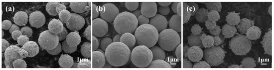 SEM images of silver-coated copper powder obtained at different main salt addition rates: (a) 3–5 mL/min, (b) 8–10 mL/min, and (c) 13–15 mL/min.