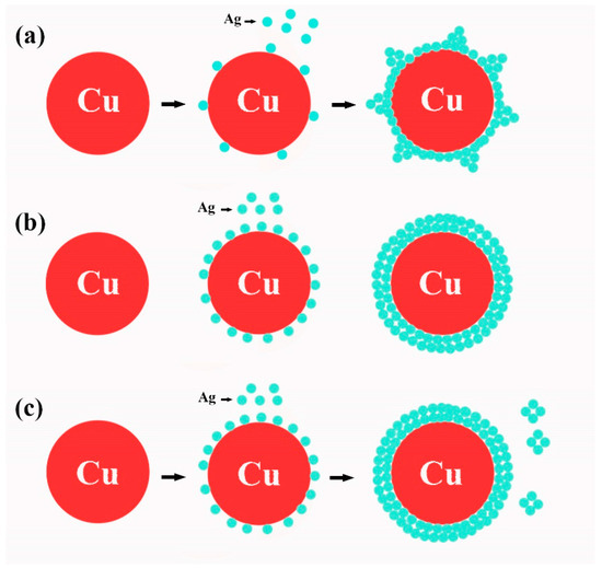 Among commonly used conductive phases, copper is favored for its ease of processing and excellent electrical properties. However, the stability of metallic copper is a concern, as it is prone to oxidation in air, forming copper oxide, which reduces its conductivity [1,2,3]. Furthermore, conductive phases used in most conductive pastes are ultrafine powders at the micron and nanometer scale. At these sizes, the activation energy of the metal surface is high, making metallic copper more susceptible to oxidation. Therefore, ultrafine copper powder is not suitable for direct use as a conductive filler in conductive paste. Silver-coated copper powder, on the other hand, consists of a copper core coated with a layer of silver. It combines the excellent thermal and oxidation stability of silver with the low cost of copper [4,5]. Therefore, developing a method to prepare high-performance silver-coated copper powder has become a key technology for reducing the cost of conductive pastes.