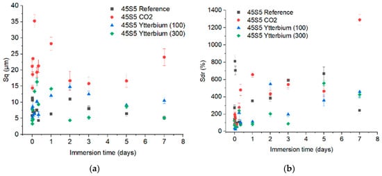 The results presented in Figure 8 elucidate the impact of laser texturing on surface roughness (Sq) and developed interfacial area ratio (Sdr) across varying time intervals during the immersion in Tris-HCl buffer. First, it is observed how the surface roughness of the untreated melt-quenched bioactive glasses increases during immersion, owing to the formation of the silica-rich layer and the apatite precipitation. The reference glasses reach Sq roughness values close to 5 μm after 7 days of immersion. The roughness evolution is faster for the 45S5 BG in comparison to the reference ICIE16 BG. The observed Sq differences for the different immersion times are statistically significant. Two differentiated stages are evident in the 45S5 BG sample. The initial stage manifests immediately following immersion, while the subsequent one emerges between 12 h and 2 days of immersion. In the case of the laser-modified 45S5 BG (Figure 8a,b), the CO2 laser results in surface roughness values that are significantly higher compared to those observed for the untreated bioactive glass. The CO2 laser-treated samples show a notable increase in Sq and Sdr values over time, particularly beyond 6 h of immersion, with a maximum Sq value of 35 μm, and after 7 days of immersion, they reach 25 μm. After 75 days of immersion in Tris-HCl buffer, the measured roughness at a long time presents an Sq value of 20 μm. The surface complexity evolution during immersion does not present a clear dependence on the CO2 laser surface modification.