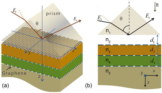Here, represents the transmission matrix at the interface between dielectrics A and B, while denotes the propagation matrix through the dielectric layer of thickness , . Consequently, we can determine the individual elements of the total transfer matrix M. As indicated by Equation (4), it is evident that the incorporation of graphene has a direct impact on the formulation of the transmission matrix, which in turn influences the complete transfer matrix M, as well as the transmission and reflection coefficients of the entire structure.