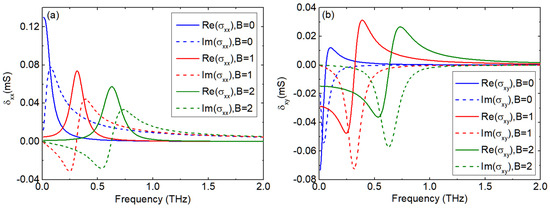 Figure 2 depicts the variation in graphene’s antisymmetric conductivity for different magnetic field strengths. For computational analysis and comparison, the parameters used align with those cited in reference [