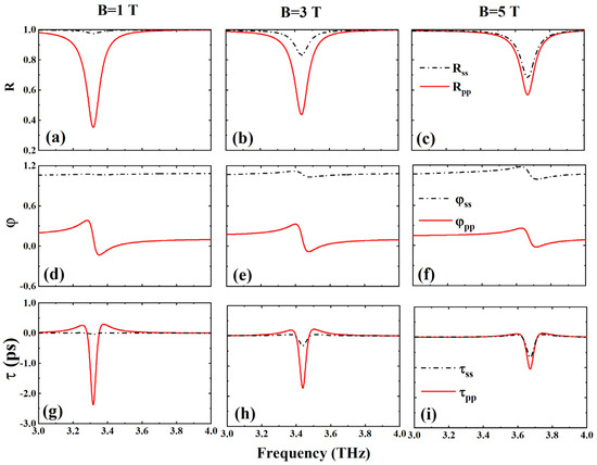 The subsequent analysis focuses on the group delay properties of the entire structure under the influence of an applied external magnetic field. It has been demonstrated that when the antisymmetric conductivity of graphene is taken into account, and the novel 4 × 4 transfer matrix method is applied, the reflection of even TM-polarized incidence encompasses both TE and TM polarization components. This complexity results in diverse group delay characteristics. To streamline the discussion and highlight key points, we primarily examine the TM-polarized reflected beam resulting from TM-polarized incidence and the TE-polarized reflected beam resulting from TE-polarized incidence. For comparison, we plot the evolution of reflectance, reflected phase, and group delay of the structure as a function of angular frequency for various external magnetic field strengths, as shown in