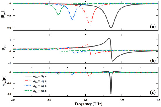 Figure 5b, exhibits a distinct sequence of changes: it first increases and then decreases as the air layer thickness is reduced. This trend indicates a complex interplay between the air layer thickness and the phase response of the reflected wave, which is key to determining the group delay characteristics. As the air layer thickness decreases, the variation in the reflection phase becomes more pronounced (