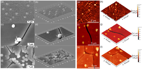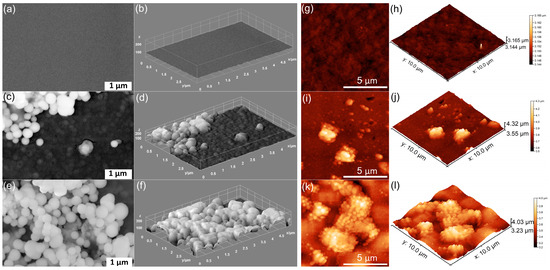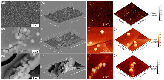 SEM images of MHA_Ch-30Gy (a), MHA_Ch-30Gy-7D (c), and MHA_Ch-30Gy-14D (e). The 3D representation of SEM images for MHA_Ch-30Gy (b), MHA_Ch-30Gy-7D (d), and MHA_Ch-30Gy-14D (f). AFM 2D topography of MHA_Ch-30Gy layers (g) and MHA_Ch-30Gy layers immersed in DMEM for 7 days (i) and 14 days (k), as well as their 3D representations (h,j,l).
