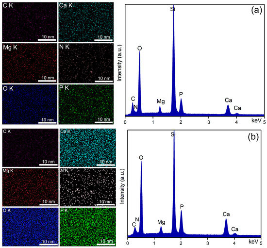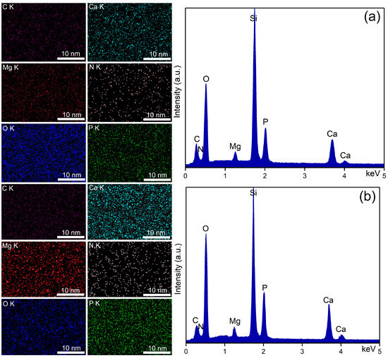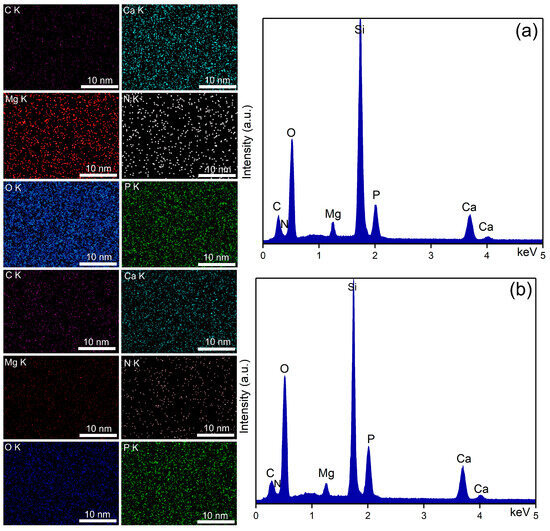 Data on the compositional homogeneity across the surface of the studied samples were provided by elemental distribution maps. The elemental distribution maps of the unirradiated and irradiated MHA_Ch layers kept for 7 and 14 days in DMEM revealed that the chemical elements (Ca, P, N, O, Mg, and C) present in the surface composition of the newly formed apatite-like layer were uniformly distributed. These findings align with those reported in previous studies [33].
