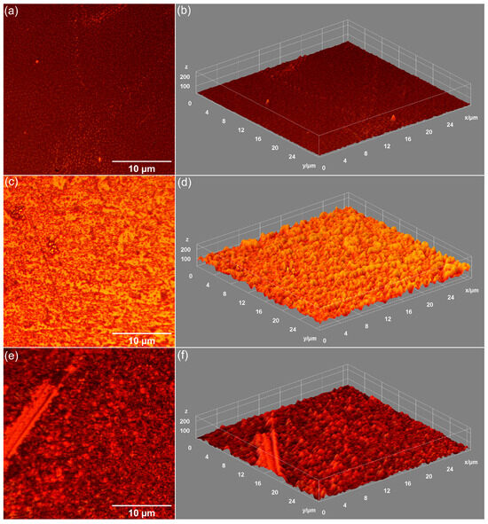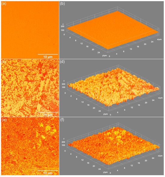 Metallographic images of MHA_Ch-8Gy (a), MHA_Ch-8Gy-7D (c), and MHA_Ch-8Gy-14D (e). 3D surface representation of metallographic images of unirradiated MHA_Ch-8Gy before (b) and after immersion in DMEM for 7 days (d) and 14 days (f).