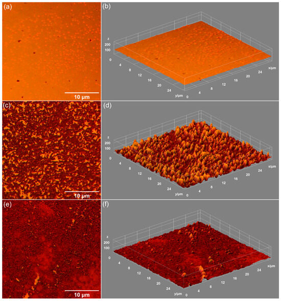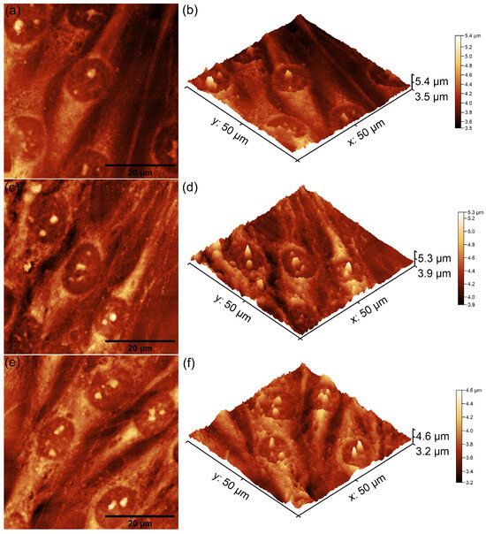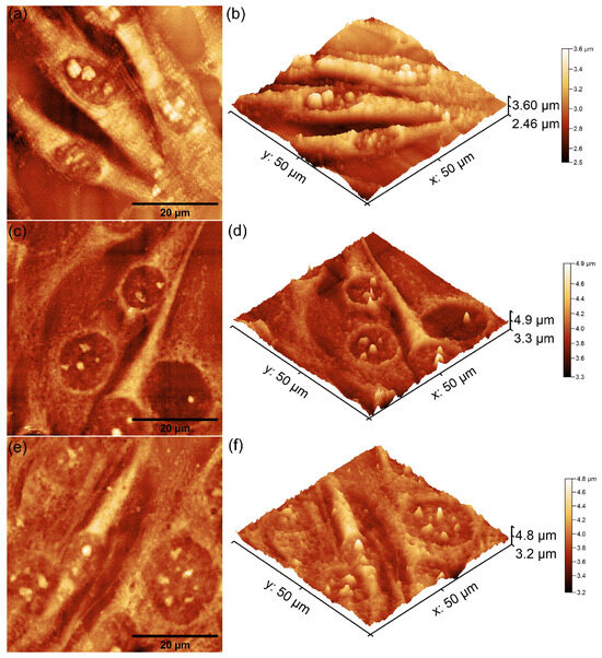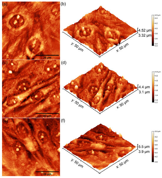 Two-dimensional AFM topography of MG63 cells after 48 h of incubation with MHA_Ch unirradiated layers (a), those immersed in DMEM for 7 days (c), and those immersed for 14 days (e), along with their 3D representations (b,d,f).