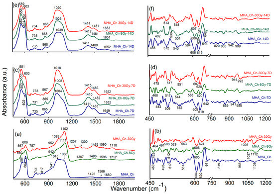 FTIR spectra of: (a) MHA_Ch, MHA_Ch-8Gy, and MHA_Ch-30Gy; (c) MHA_Ch-7D, MHA_Ch-8Gy-7D, and MHA_Ch-30Gy-7D; (e) MHA_Ch-14D, MHA_Ch-8Gy-14D, and MHA_Ch-30Gy-14D; Second derivative spectra obtained for: (b) MHA_Ch, MHA_Ch-8Gy, and MHA_Ch-30Gy; (d) MHA_Ch-7D, MHA_Ch-8Gy-7D, and MHA_Ch-30Gy-7D; (f) MHA_Ch-14D, MHA_Ch-8Gy-14D, and MHA_Ch-30Gy-14D.
