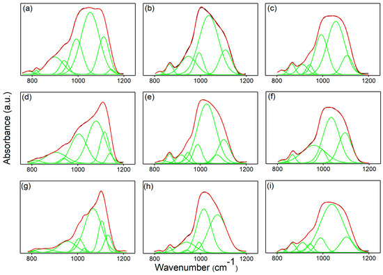FTIR deconvoluted spectra of MHA_Ch (a), MHA_Ch-7D (b), MHA_Ch-14D (c), MHA_Ch-8Gy (d) MHA_Ch-8Gy-7D (e), MHA_Ch-8Gy-14D (f), MHA_Ch-30Gy (g), MHA_Ch-30Gy-7D (h), and MHA_Ch-30Gy-14D (i).