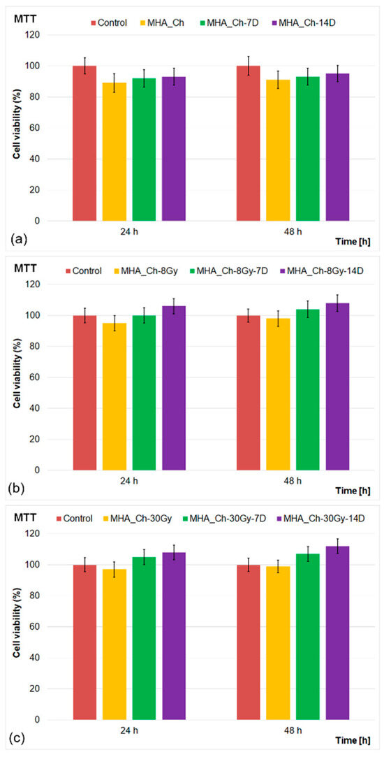 MTT assay of MG63 cells incubated for 24 and 48 h with MHA_Ch (a), MHA_Ch-8Gy (b), and MHA_Ch-30Gy (c) layers before and after immersion in DMEM for 7 and 14 days. The results are represented as mean ± standard deviation (SD) and are expressed as percentages of control (100% viability).