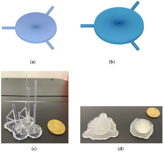 (a) CAD design of Fresnel lens, (b) CAD design of plano-convex lens, (c) additively manufactured unprocessed WG prototypes, (d) additively manufactured unprocessed lens prototypes.