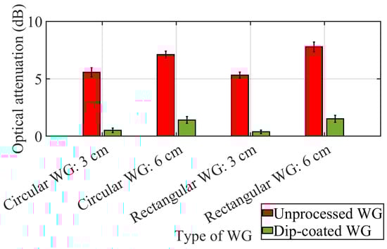 In order to ascertain that the dip-coating process does not cause additional losses, we verified the optical attenuation using the cut-back technique based on [36] and a 1550 nm laser beam Thorlabs MCLS1. The laser beam diameter of 1 mm was adjusted using a commercial lens with a focal length of 4 cm. For reference, the beam initially propagated through free space. After that, the laser beam was again passed through both the rectangular and circular WGs mounted on suitable opto-mechanical holders. An iris was used to avoid the direct line-of-sight coupling of the laser beam into the power meter. On the receiver side, we used an optical power meter (Thorlabs PM320E with a Thorlabs S122C sensor head). Figure 3 shows the attenuation of the WGs obtained for different rectangular and circular WGs before and after dip-coating, along with the SD. Compared to our previous results in Section 1, the waveguiding losses ranged from 1 to 1.5 dB per cm of the WG. Before and after dip-coating, the losses were reduced by more than 4 dB in all cases, in agreement with a previous measurement in which we found an improvement of 5 dB [3]. We deduced that the remaining losses predominantly originated from material absorption and coupling losses. Moreover, rectangular WGs seemed to feature slightly lower losses than circular WGs. The distribution of dip-coated resin material over rectangular WGs, compared to circular WGs, can be attributed to the dipping angle and the position of the WGs inside the resin material.