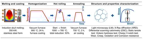Alloy manufacturing and testing methods are shown schematically in Figure 1. Titanium alloy Ti-5Al-2.5Sn-0.2C with 0.2 wt% of carbon in comparison with titanium alpha alloy Grade 6 was studied. Chemical composition of the investigated alloys is presented in Table 1. The analysis of the chemical composition (alloying elements) was performed by using the Inductively Coupled Plasma—Optical Emission Spectroscopy (ICP-OES) methods. Oxygen, nitrogen, and hydrogen content were measured by inert gas fusion with infrared detection. Carbon was determined by combustion infrared detection, respectively, via Leco ONH836 and CS844 analyzers (interstitial elements). Titanium alloy with carbon was melted in a vacuum induction furnace with a cold copper crucible. Carbon was introduced in the form of anthracite (94% C, as raw materials ~50 mm pieces). Re-melted materials were cast via gravity casting to ingots 40 mm in diameter and 350 mm in length and were annealed in the vacuum furnace at 900 °C/24 h/furnace cooling and then hot rolled. The samples were rolled to a total strain of 93% reduction. The obtained bars 12 mm in diameter were subjected to final heat treatment conducted under standard conditions for the reference titanium alloy Ti-5Al-2.5Sn (Grade 6 without additional carbon content), which consisted of annealing (750 °C/2 h/air cooling).