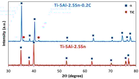 The analysis of the phase composition results for the Ti-5Al-2.5Sn-0.2C alloy and the carbon-free reference Ti-5Al-2.5Sn alloy, presented as a double diffractogram in Figure 2, indicates the presence of the alpha phase in the structure of both alloys. Additionally, distinct reflections corresponding to non-stoichiometric TiCx carbide are observed exclusively in the diffractogram of the carbon-containing alloy. The lattice parameter of this carbide determined with XRD is 0.4310 nm (Table 2), which is close to the value of the lattice parameter of stoichiometric TiC carbide, which is 0.4327 nm [30].