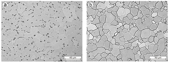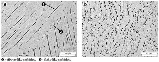 As shown in Figure 3, the crystallization process of the Ti-5Al-2.5Sn-0.2C alloy begins at approximately 1660 °C with the precipitation of the primary β-phase from the liquid solution, following the sequence L → L + β. At room temperature, after crystallization and subsequent phase transformations described by the Ti-9Al-C equilibrium system, L → L + β → β → α + β → α → α + TiC, and after achieving equilibrium through 24 h annealing at 900 °C followed by slow cooling, the microstructure is expected to consist of the α-phase and finely dispersed TiC carbide precipitates. The relative volume of these carbides, estimated using the lever rule, is approximately 1.5%. These carbides are predicted to precipitate at temperatures below 500 °C from the α-phase due to a decrease in carbon solubility. However, the actual microstructure of the cast and annealed Ti-5Al-2.5Sn-0.2C alloy (Figure 4a) reveals large, irregularly shaped carbides (shape factor: 0.52) instead of the expected dispersed carbides. Additionally, the fraction of the area occupied by these carbides is measured at only 0.95% (Table 3). These observations indicate that the crystallization conditions of the Ti-5Al-2.5Sn-0.2C alloy during ingot solidification deviate significantly from equilibrium.