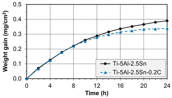 In addition to the widely recognized methods for improving the oxidation resistance of alpha titanium alloys—such as introducing suitable alloying elements, modifying the surface layer’s chemical composition through surface treatments, or applying specialized protective coatings—an effective approach may also involve reducing the diffusion activity of oxygen by limiting its solubility in the alpha phase. Carbon atoms, occupying the same octahedral interstitial sites as oxygen atoms in the titanium-based alpha solid solution, can restrict oxygen solubility and reduce its diffusion activity, thereby contributing to enhanced oxidation resistance. The results of isothermal oxidation kinetics studies for the Ti-5Al-2.5Sn alloy, with and without carbon, are presented in Figure 7. The oxidation curves, which show weight gain per unit area as a function of oxidation time (up to 24 h), reveal that the oxidation behavior of both alloys is initially very similar. However, as oxidation time increases, the weight gain of the carbon-containing alloy gradually becomes lower compared to the carbon-free alloy. The oxidation behavior of both alloys follows the parabolic oxidation law described by the Pilling–Bedworth equation. The parabolic oxidation rate constants, determined based on this equation, are 1.74 × 10−12 for the carbon-free alloy and 1.50 × 10−12 g2·cm−4·s−1 for the carbon-containing alloy. These values indicate a modest yet beneficial effect of carbon on the oxidation resistance of the Ti-5Al-2.5Sn-0.2C alloy.