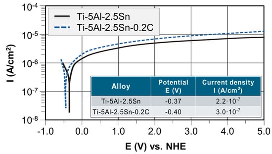 A comparison of the polarization curves (Figure 8), the corrosion potential values, and the corrosion current densities of the Ti-5Al-2.5Sn-0.2C alloy and the carbon-free Ti-5Al-2.5Sn alloy indicates that the addition of 0.2 wt% carbon has a negligible impact on the excellent corrosion resistance of this alloy.