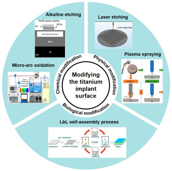 This review of these three surface modification techniques of titanium alloys aims to enhance the understanding of titanium alloy surface modification technology and its biomedical applications. By exploring how each technique changes the surface morphology and properties of implants, it provides a comprehensive reference for future research. This knowledge will help researchers overcome existing limitations in implant design and performance. For example, understanding the mechanisms of how different modifications influence osseointegration can guide the development of more effective implants with improved biocompatibility, corrosion resistance, and mechanical stability. This, in turn, will lead to better clinical results, such as reduced implant failure rates and improved patient outcomes in orthopedic and dental implant procedures. The following article will summarize the three aspects of the modification of titanium metal: chemical, biological, and physical modification, as illustrated in Figure 1.