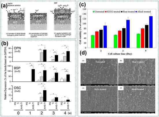 The alkali heat treatment method was first proposed by Kim HM []. The method is first to soak titanium in a 10 mol/L sodium hydroxide solution and then heat treat it at a high temperature of 600 °C to form a thin layer of sodium titanate on the titanium surface layer, thereby inducing the deposition of osteoid hydroxyapatite for better osseointegration (Figure 3a). Research has found that hydroxyapatite nucleation can be promoted only by pretreatment with an alkali solution and heat treatment to obtain ideal Ca2+, OH− and PO43− concentrations around titanium []. Chosa et al. [] found that the apatite was bone-like and accelerated osteogenic differentiation, which showed that alkaline heat treatment might facilitate better integration of titanium implants with bone (Figure 3b). Khodaei et al. [] applied three types of surface modifications on Ti6Al4V alloy, including heat treatment, H2O2 treatment, and alkali treatment. They compared the surface properties, in vitro bioactivity, and in vitro cytocompatibility of the Ti6Al4V alloy. The three treatments all enhanced the in vitro bioactivity and cytocompatibility of implants. It is worth noting that alkali treatment exhibits a more effective effort in increasing the cell viability and bioactivity of the Ti6Al4V alloy (Figure 3c,d). In addition, the rough surface obtained by the alkaline heat treatment of titanium can significantly improve the shear strength of the osseointegration interface of titanium implants. It can be used clinically to improve the stability of orthodontic implants [].