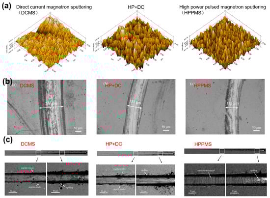 (a) Atomic force microscope pictures, (b) wear tracks, and (c) scratch tests of TiN film by DCMS, HP + DC, and HPPMS modes. Reprinted with permission from ref. []. Copyright 2018, MDPI.