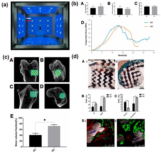 (a) The picture of the inside of the omnidirectional UV radiator. Reprinted with permission from ref. []. Copyright 2022, Elsevier; (b) Comparison of mechanical properties of Group GC and Group GU: A yield strength, B elastic modulus, C compression strength, and D stress–strain curves. Reprinted with permission from ref. []. Copyright 2022, Elsevier; (c) Micro-CT analysis and quantitative analysis of osseous integration. Reprinted with permission from ref. []. Copyright 2022, Elsevier; (d) Histological images of the integration between the two groups of newly formed bone tissue and the titanium alloy surface. Reprinted with permission from ref. []. Copyright 2022, Elsevier.