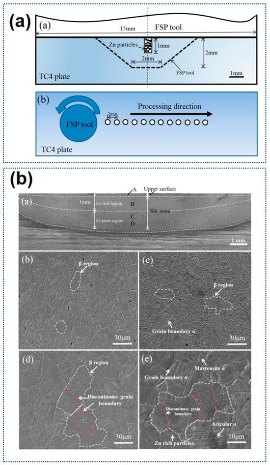 (a) The schematical diagram of Zn addition during FSP. Reprinted with permission from ref. []. Copyright 2019, MDPI; (b) The microstructures of TC4/Zn composites. Reprinted with permission from ref. []. Copyright 2019, MDPI.